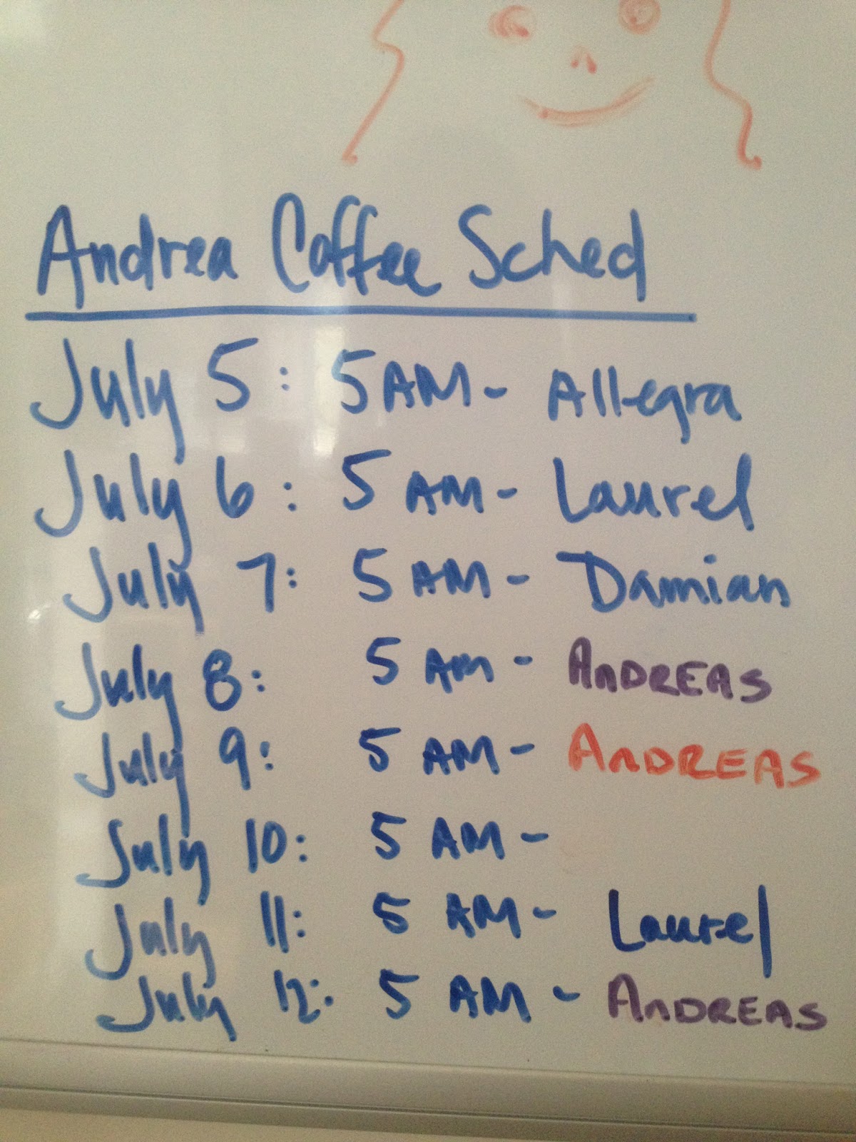 Andrea Coffee Schedule. So far, Allegra, Laurel, Andreas (yes, we have an Andrea and an Andreas in the same house!) and Damian have signed up. Damian is even getting up on a Sunday! The only day he gets to sleep in.
